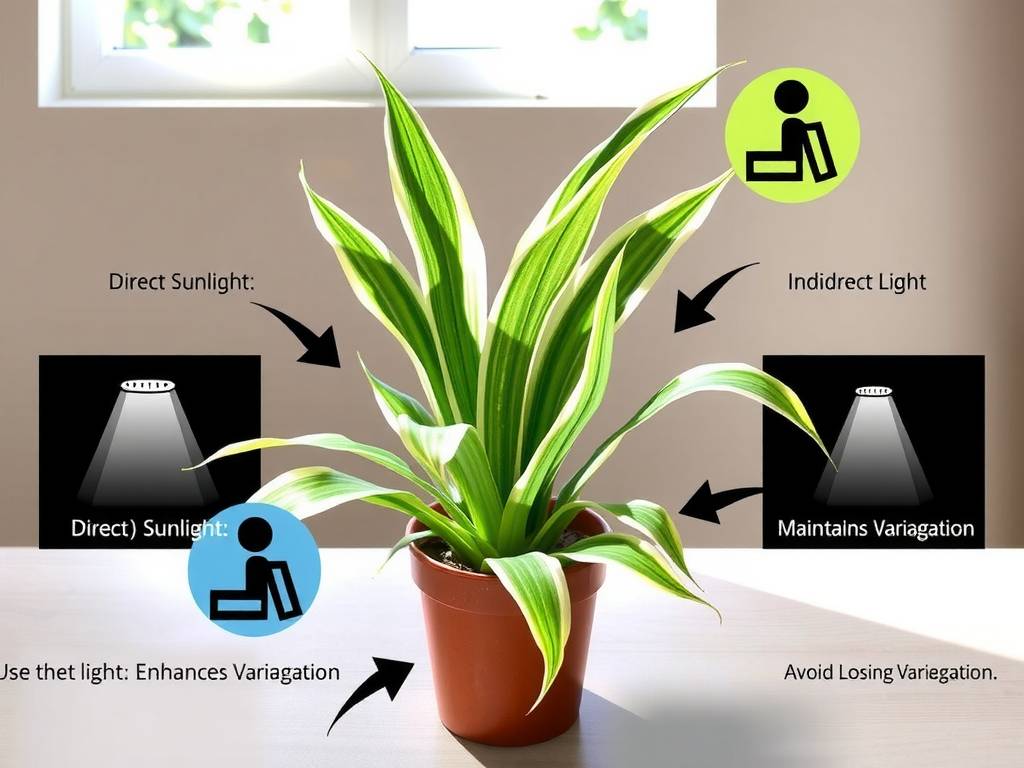 Your variegated spider plant craves bright, indirect light. Think of the light in a room with a large, north or east-facing window, or a few feet back from a sunny south or west window where the sun’s rays never directly touch the foliage.